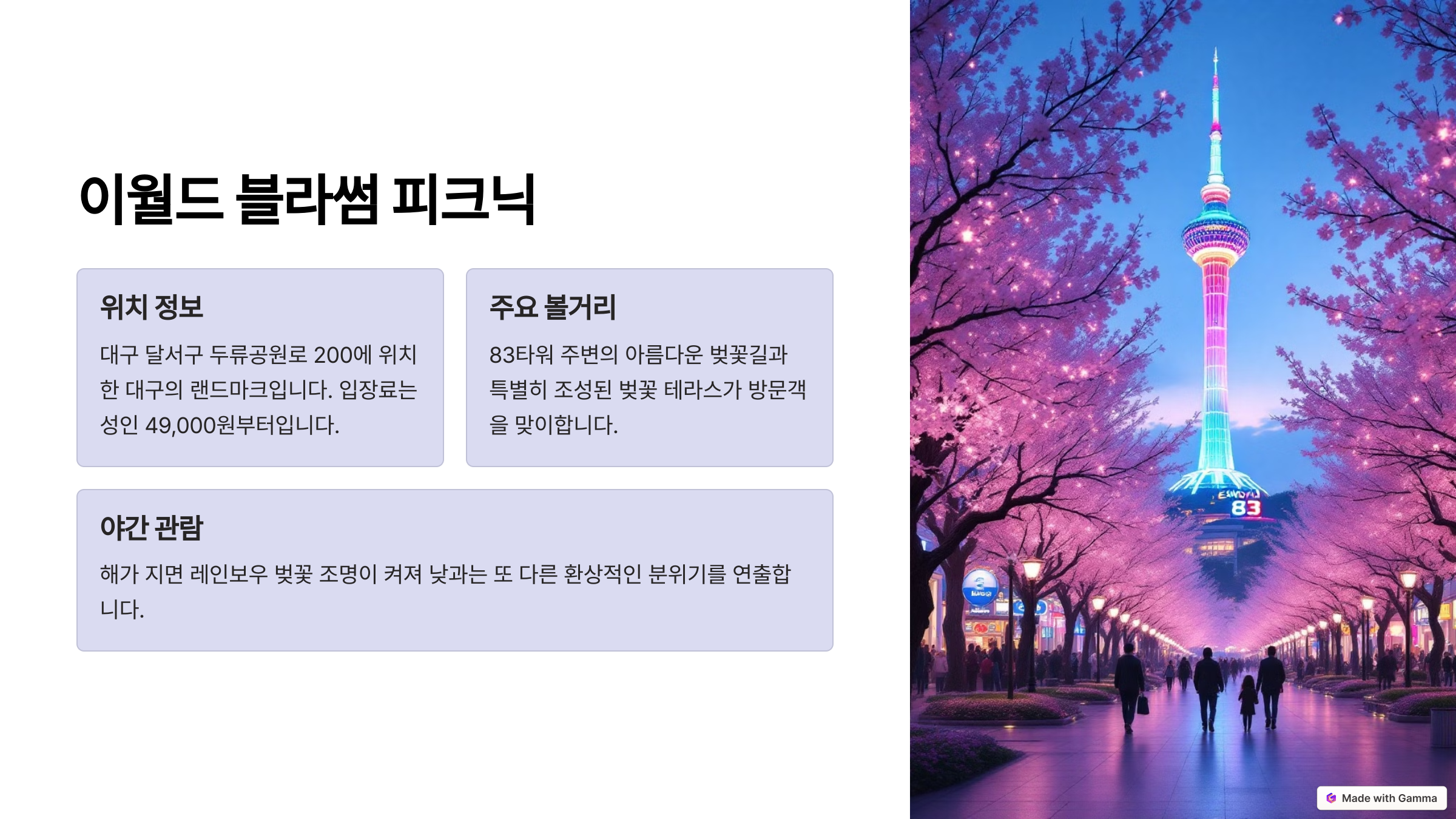 이월드는 대구의 랜드마크로 봄철 '블라썸 피크닉' 벚꽃축제로 유명합니다.