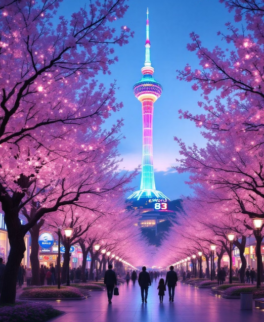 주요 볼거리: 83타워 벚꽃길, 벚꽃 테라스, 빨간 2층버스, 회전목마, 블라썸 마켓, 야간 레인보우 조명