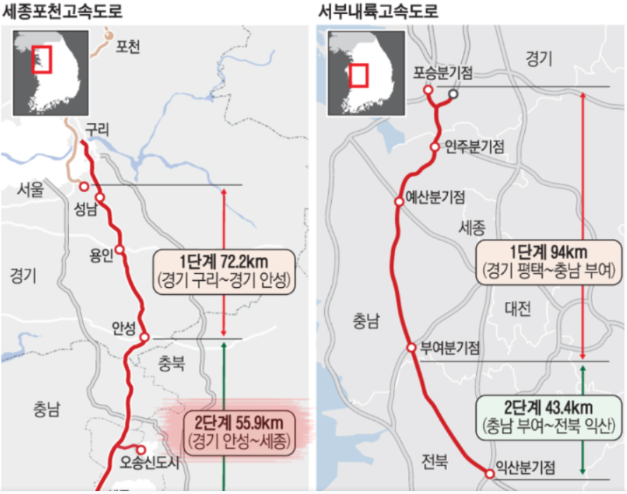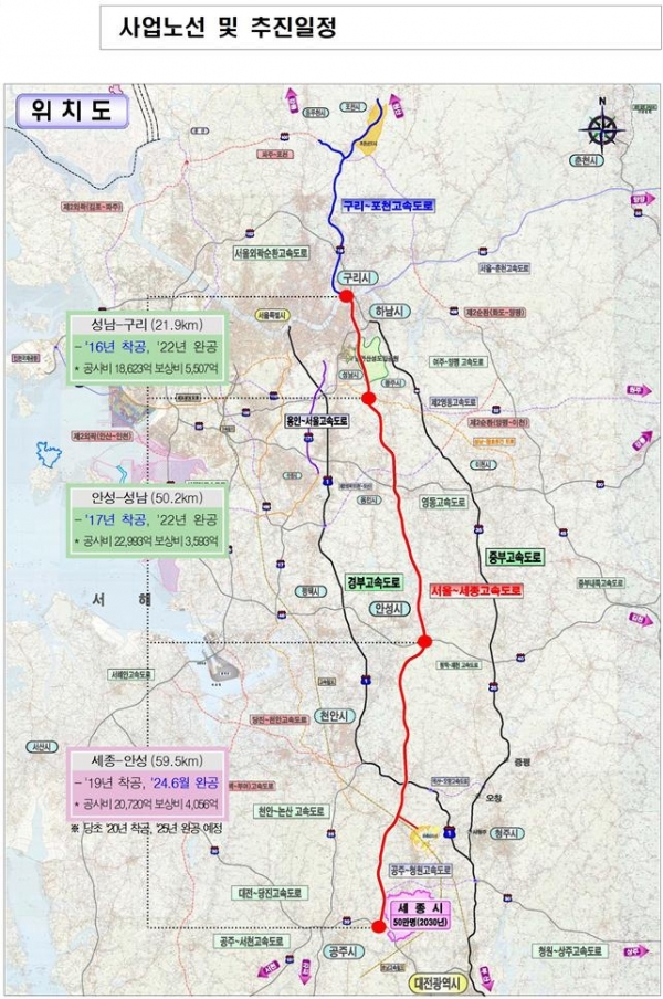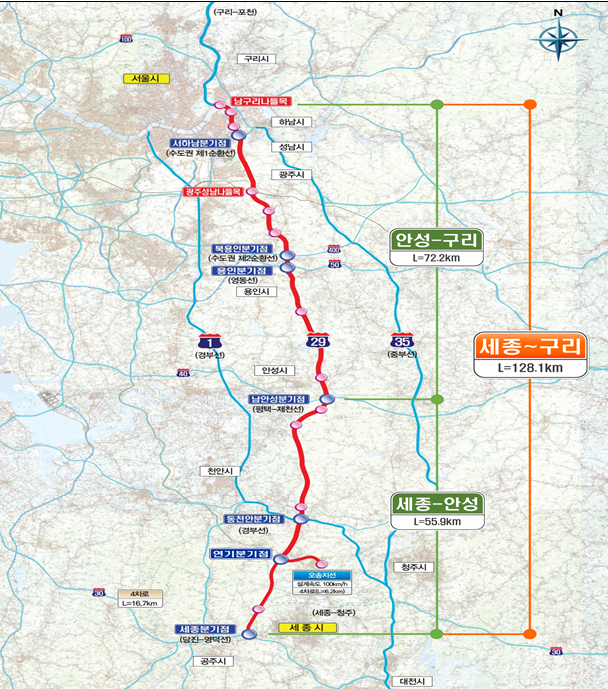 세종~포천 고속도로는 포천에서 세종까지 이어지는 총연장 176.3㎞의 대규모 고속도로다. 안성-용인-구리 구간은 왕복 6차선 도로로 국비 7조4367억원이 투입되었습니다.