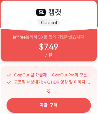 | 캡컷 프로 | 9,900원 | 3,000~4,500원 | 5,400~6,900원 | 약 54~69% |