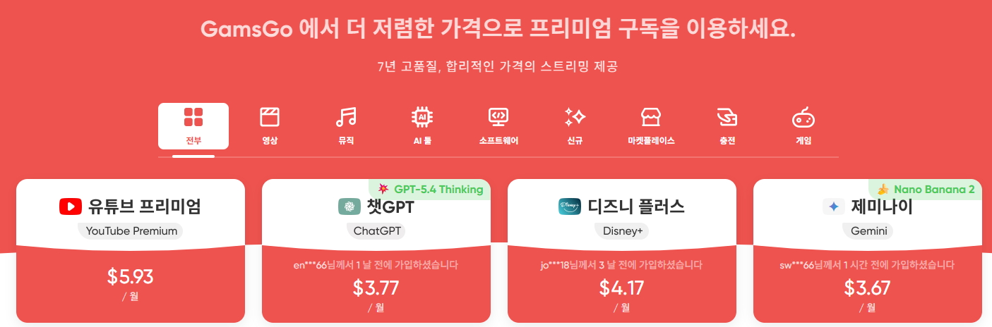 프리미엄 구독을 더 저렴하게! GamsGo에서 ChatGPT 4.0, YouTube Premium, Netflix 등 다양한 서비스를 할인된 가격에 공유해보세요. 겜스고와 함께 비용 절약하고 최고의 혜택을 누리세요!